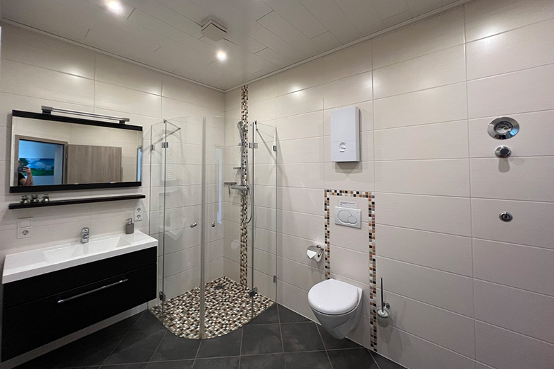 2-türiger Schrank, Sessel - ein geräumiges Bad mit ebenerdiger Dusche, WC, Waschbecken, Spiegel