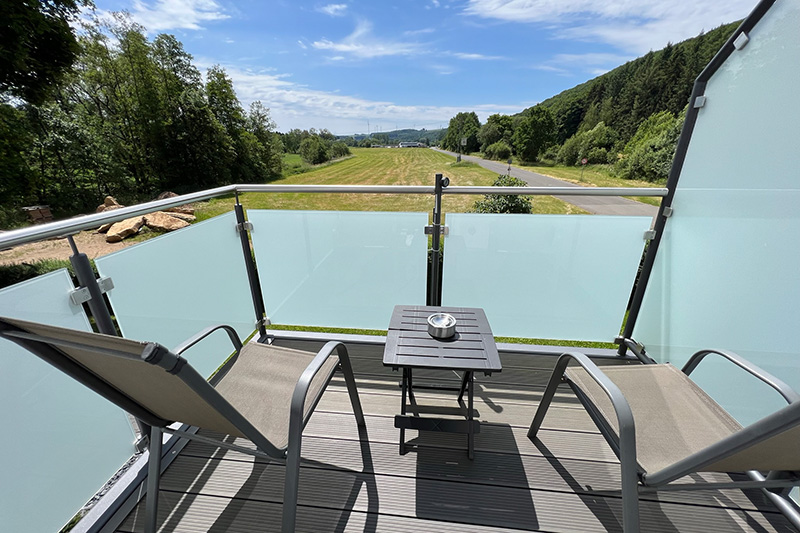 Bei geöffnetem Fenster kann man die "Prüm" vorbeirauschen hören oder den Vögeln zuhören, denn der Blick aus dem Fenster schweift über Wiesen, Bach und Gebüsch. Aus dem nach Süden gelegenen Wohnzimmerfenster können Sie durch Prümtal bis nach Pronsfeld sehen.