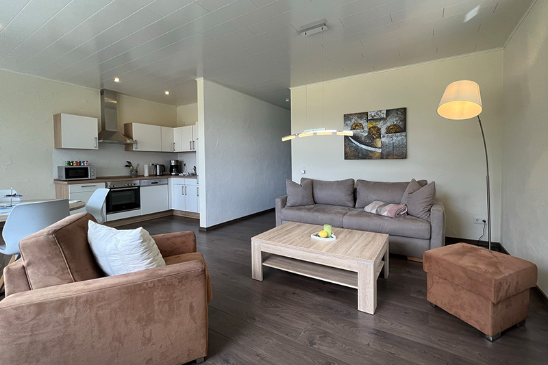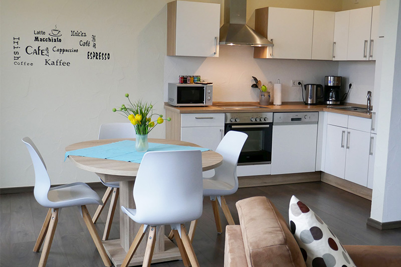 Wir haben die Wohnung "Kommerswag" getauft, weil die angrenzende Wiese so heißt. Die Ferienwohnung hat Platz für 2 Personen, liegt im 1. Stock und hat 66 qm Wohnfläche. Ein Schlafzimmer, Wohnzimmer mit offener Küche, Essecke, Diele und Bad laden zum gemütlichen Verweilen ein. Es ist auch noch Platz für ein Kinderbettchen frei. Im Wohnzimmer besteht die Möglichkeit für zwei weitere Personen zu schlafen.