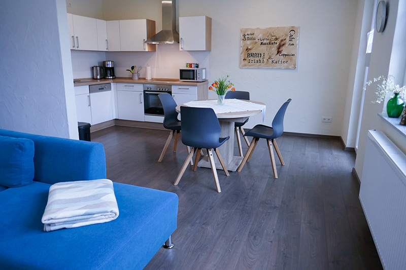 Das Wohnzimmer mit offener Küche, Essecke, Diele und Bad laden zum gemütlichen Verweilen ein.