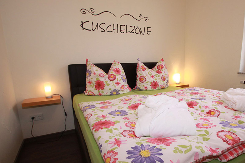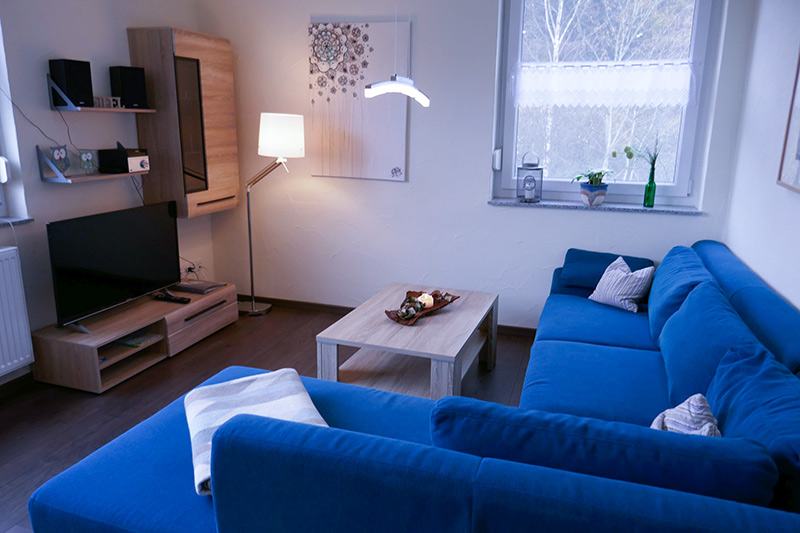 Wir haben der Wohnung den Namen "Ober Langengarten" gegeben, weil die angrenzende Wiese so heißt. Die Ferienwohnung hat Platz für 4 Personen, liegt im 1. Stock und hat 68 qm Wohnfläche. Die zwei Schlafzimmer liegen nach vorne zum Radweg hin, der Blick fällt über den Radweg hinweg direkt auf Buchen- und Fichtenwald, bei geöffnetem Fenster kann man die Vögeln singen hören oder dem Rauschen der Bäume lauschen.