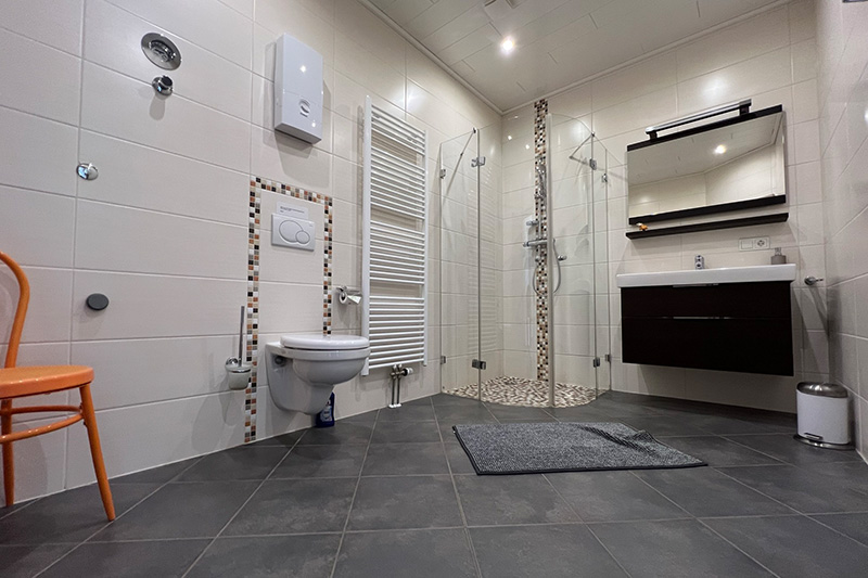 2-türiger Schrank, Stuhl - ein geräumiges Bad mit ebenerdiger Dusche, WC, Waschbecken, Spiegel