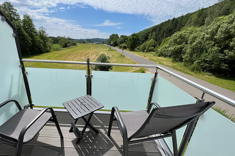 Bei einer guten Tasse Kaffee können Sie sich auf dem Balkon entspannen oder das Treiben auf dem Radweg beobachten.