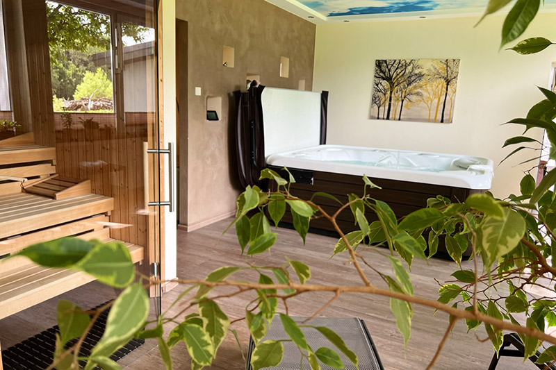 Relaxen Sie alleine und ungestört in unserer Wellness-Oase mit Bio-Sauna, ( Dampf- oder finnische Sauna nach Wahl ), Jacuzzi-Whirlpool, Ruheraum, Massagebank, Shiatsu-Massage-Stuhl, Kaffee-Ecke, und Wintergarten.